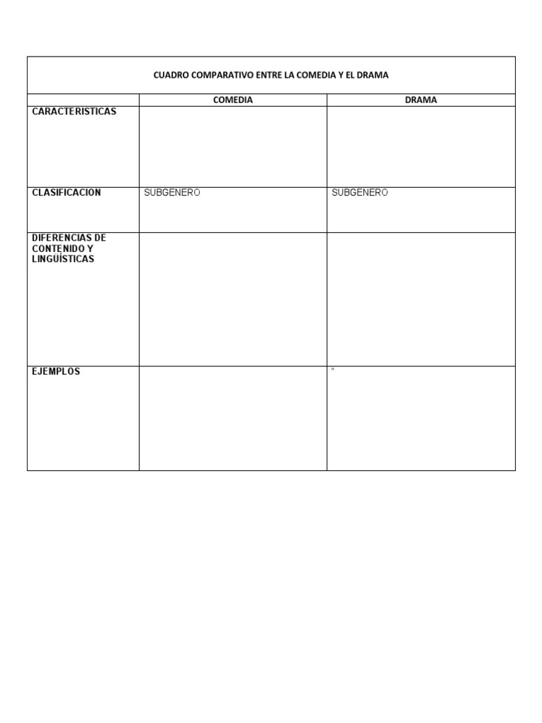 Este cuadro comparativo muestra las principales características de los géneros teatrales más importantes: drama, comedia y tragedia. Aunque los tres comparten ciertas similitudes, como el uso de personajes y conflictos para contar una historia, difieren significativamente en cuanto a su tono, temas y final. El drama es un género teatral.