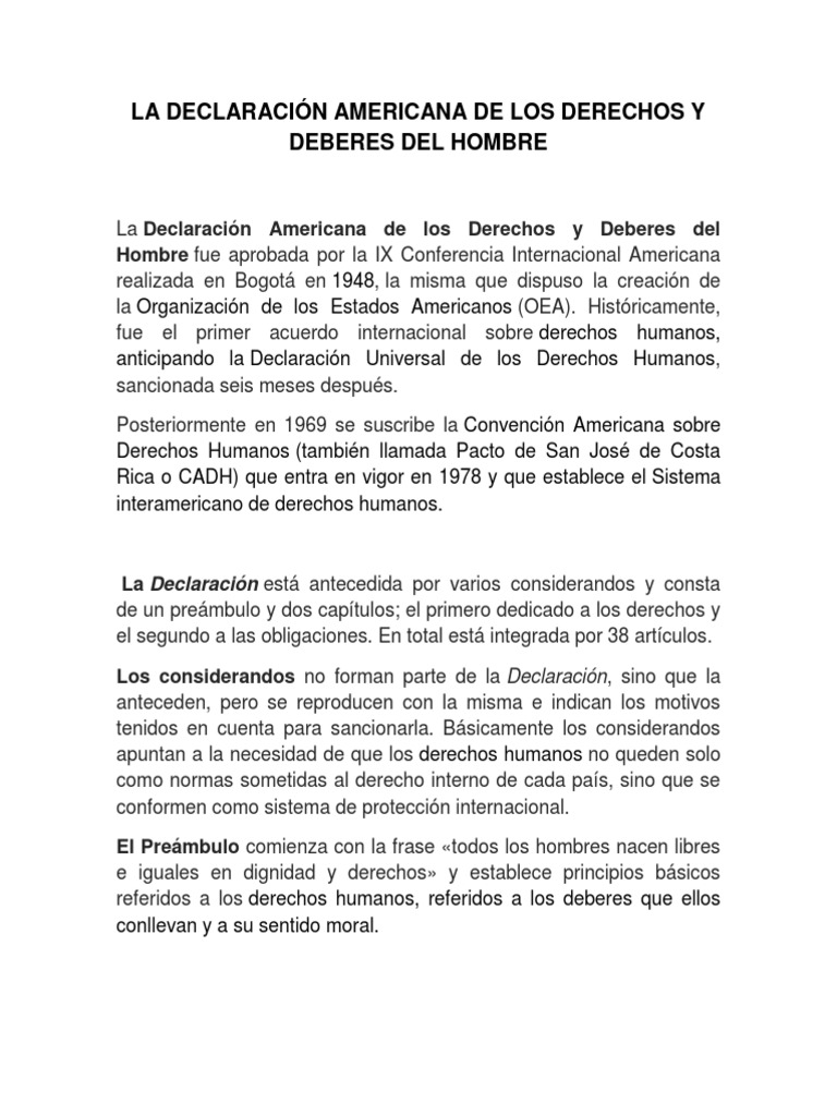 Updated: Mar 21. La Declaración Americana de Derechos y Deberes del Hombre es un instrumento mediante el cual los Estados del continente americano acordaron el reconocimiento internacional de un listado de los derechos humanos que tienen todas las personas por el simple hecho de ser seres humanos, sin distinción de raza, sexo, idioma, credo.