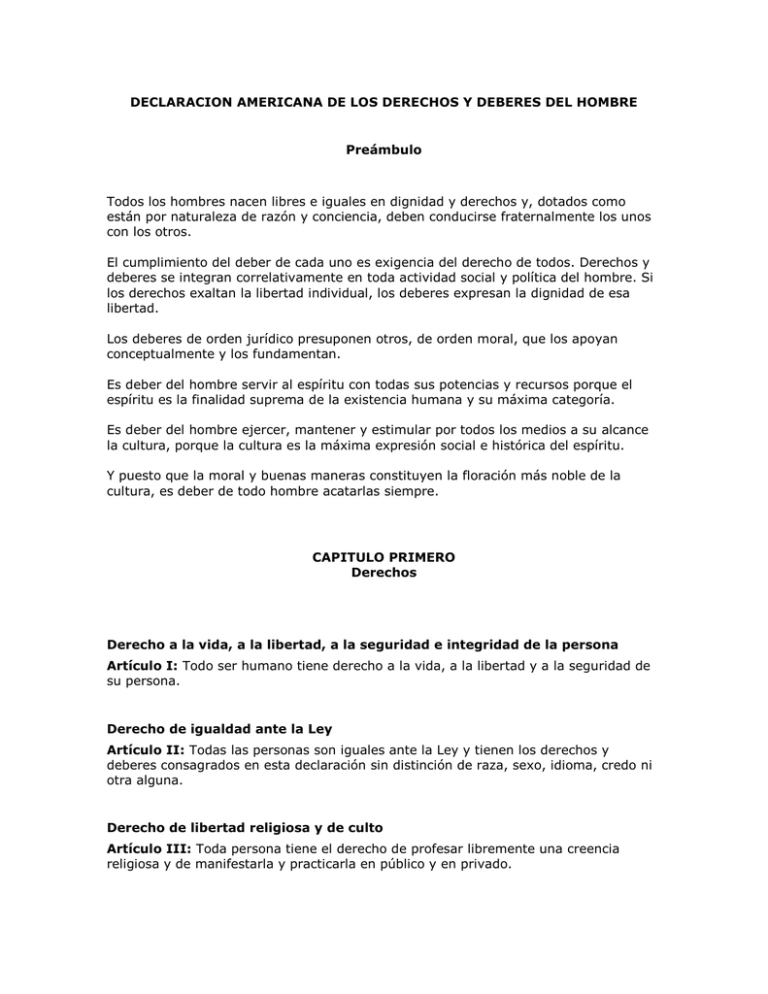 Artículo I. - Todo ser humano tiene derecho a la vida, a la libertad y a la seguridad de su persona. Artículo II. - Todas las personas son iguales ante la ley y tienen los derechos y deberes consagrados en esta declaración sin distinción de raza, sexo, idioma, credo ni otra alguna. Artículo III. - Toda persona tiene el derecho de profesar libremente una creencia religiosa y de.