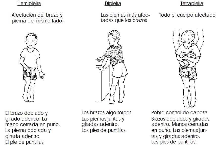 Según cuál se la parte del cuerpo afectada, la parálisis cerebral puede clasificarse del siguiente modo: Hemiplejia: cuando afecta sólo a uno de los dos lados del cuerpo, mientras que el otro permanece normal. Monoplejia: si solo afecta a una de las extremidades. Triplejia: con la afectación de tres miembros.