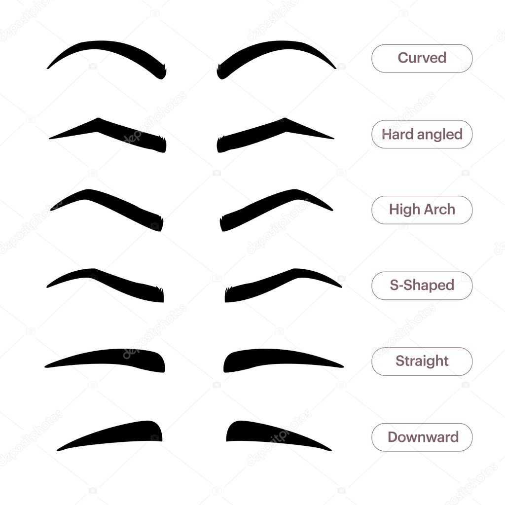 Formas de cejas. Varios tipos de cejas. Tipo clásico y otros. Recorte. Ilustración vectorial con