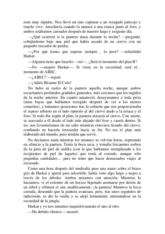 Aun así, allí estábamos, al borde de un foso que habíamos cavado el día anterior, contemplando al ciervo que habíamos atrapado y que estábamos usando como cebo, esperando a una pantera. Cirque du Freak - 10 El lago de las almas ~ Shan, Darren ~.