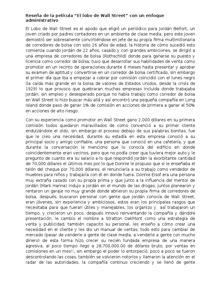 El lobo de Wall Street - Reseña y análisis de película. Ene 14, 2014. El lobo de Wall Street está ambientada en 1987, muestra la carrera de Jordan Belfort el corredor de bolsa novato que un día llega a Wall Street con la sola idea de comerse el mundo desde su lugar de trabajo, venido de la clase media con sueños de grandeza a costa de.