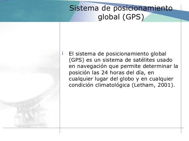 El Sistema de Posicionamiento Global (GPS) es un sistema de navegación que utiliza satélites, un receptor y algoritmos para sincronizar datos de ubicación, velocidad y tiempo para viajes aéreos, marítimos y terrestres. El sistema de satélites consiste en una constelación de 24 satélites en seis planos orbitales centrados en la Tierra.