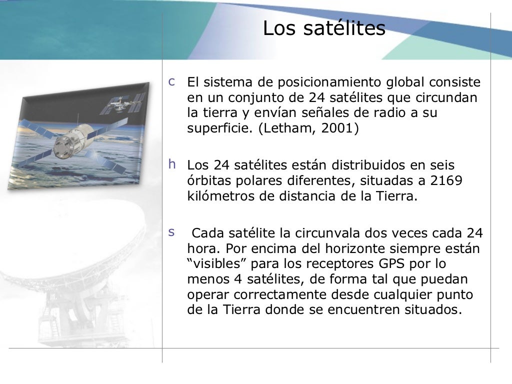 El Sistema de Posicionamiento Global. GPS ( Global Positioning System) es una constelación de 24 satélites artificiales uniformemente distribuidos en un total de 6 órbitas, de forma que hay 4 satélites por órbita. Esta configuración asegura que siempre puedan "verse" al menos 8 satélites desde casi cualquier punto de la superficie terrestre.