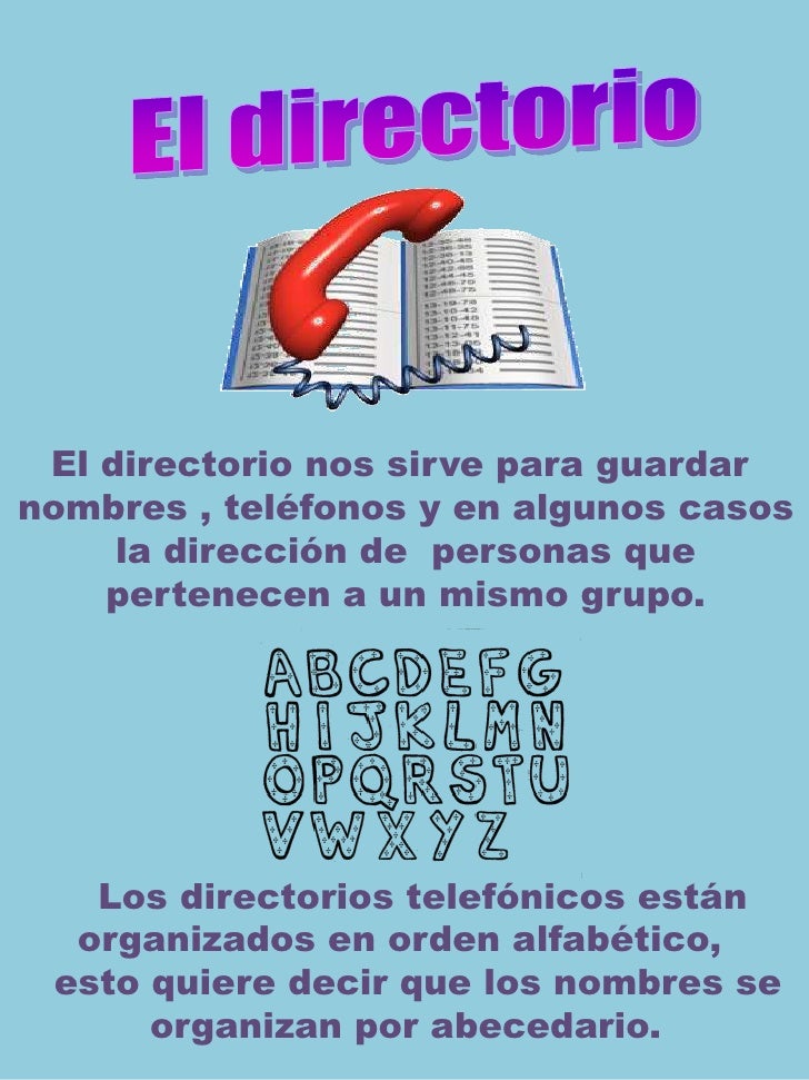 Puntuación: 5/5 ( 20 valoraciones ) Un directorio es una guía donde están los datos de diferentes personas como su domicilio, teléfono, etc., sirven para localizar personas, lugares o servicios. También puedes anotar otros datos como: Número celular. Otros números telefónicos dónde localizar a la persona.