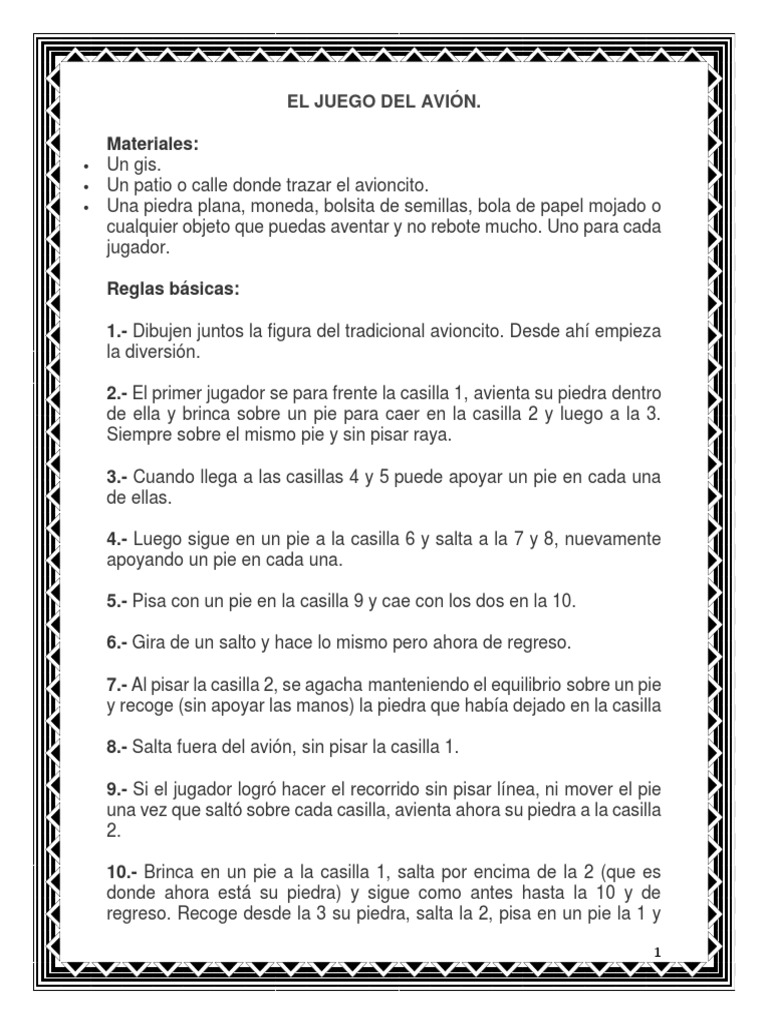 Reglas paso a paso: Dibujen juntos la figura del tradicional avioncito. Todos juntos, no se vale cargarle la mano a uno nada más. El primer jugador se para frente la casilla 1, avienta su piedra dentro de ella y brinca sobre un pie para caer en la casilla 2 y luego a la 3. Siempre sobre el mismo pie y sin pisar la raya.