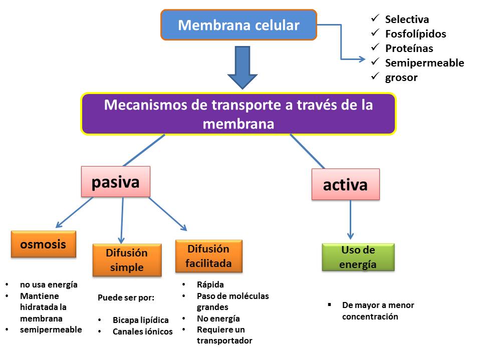 Existen dos maneras mediante las cuales la célula puede transportar moléculas hacia fuera y hacia adentro de ella: El transporte pasivo: Mecanismo por el cual las sustancias atraviesan la membrana celular a favor de sus gradientes de concentración, por lo tanto no requieren de un aporte energético. El transporte activo: Tipo de transporte en el cual las sustancias que atraviesan la.